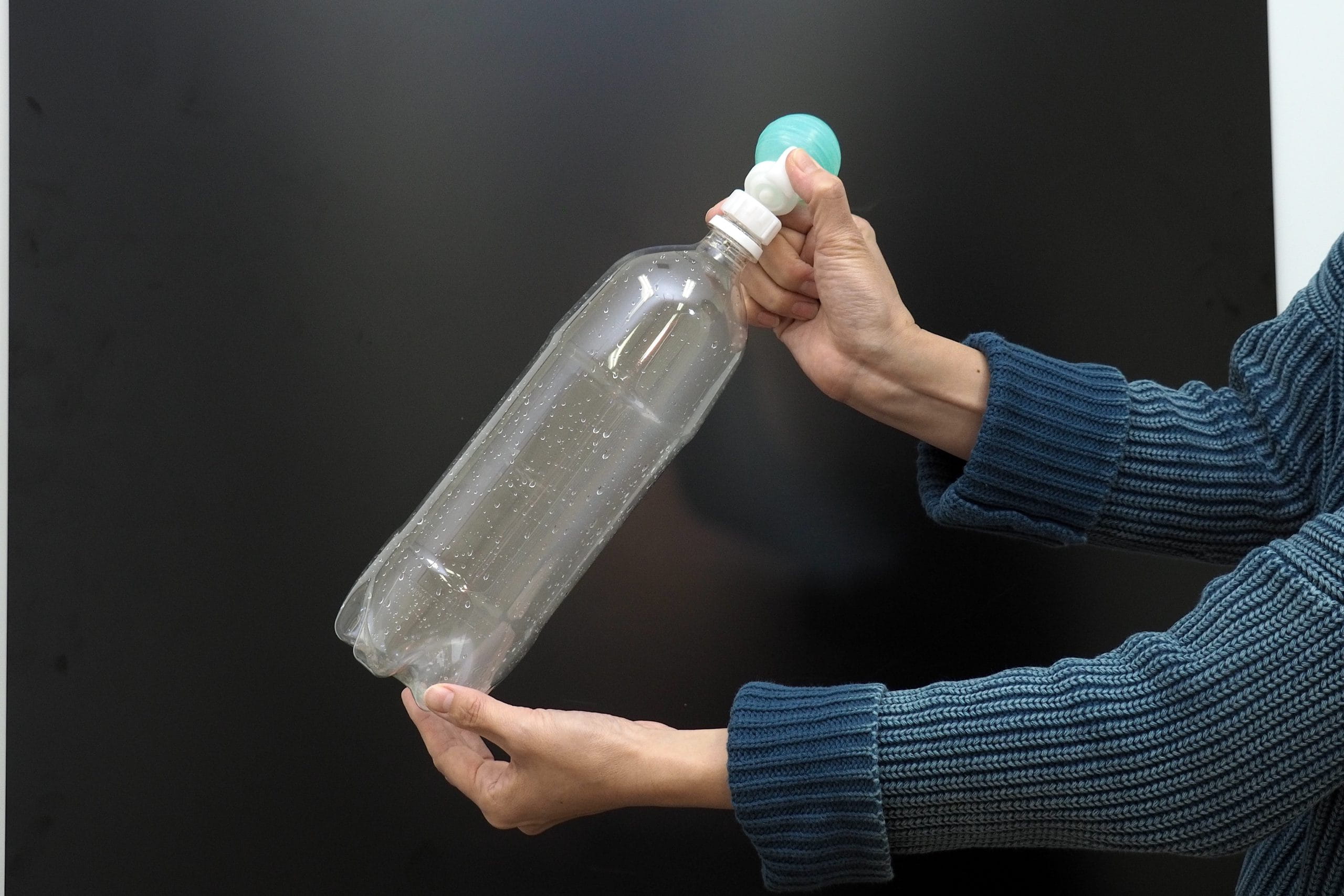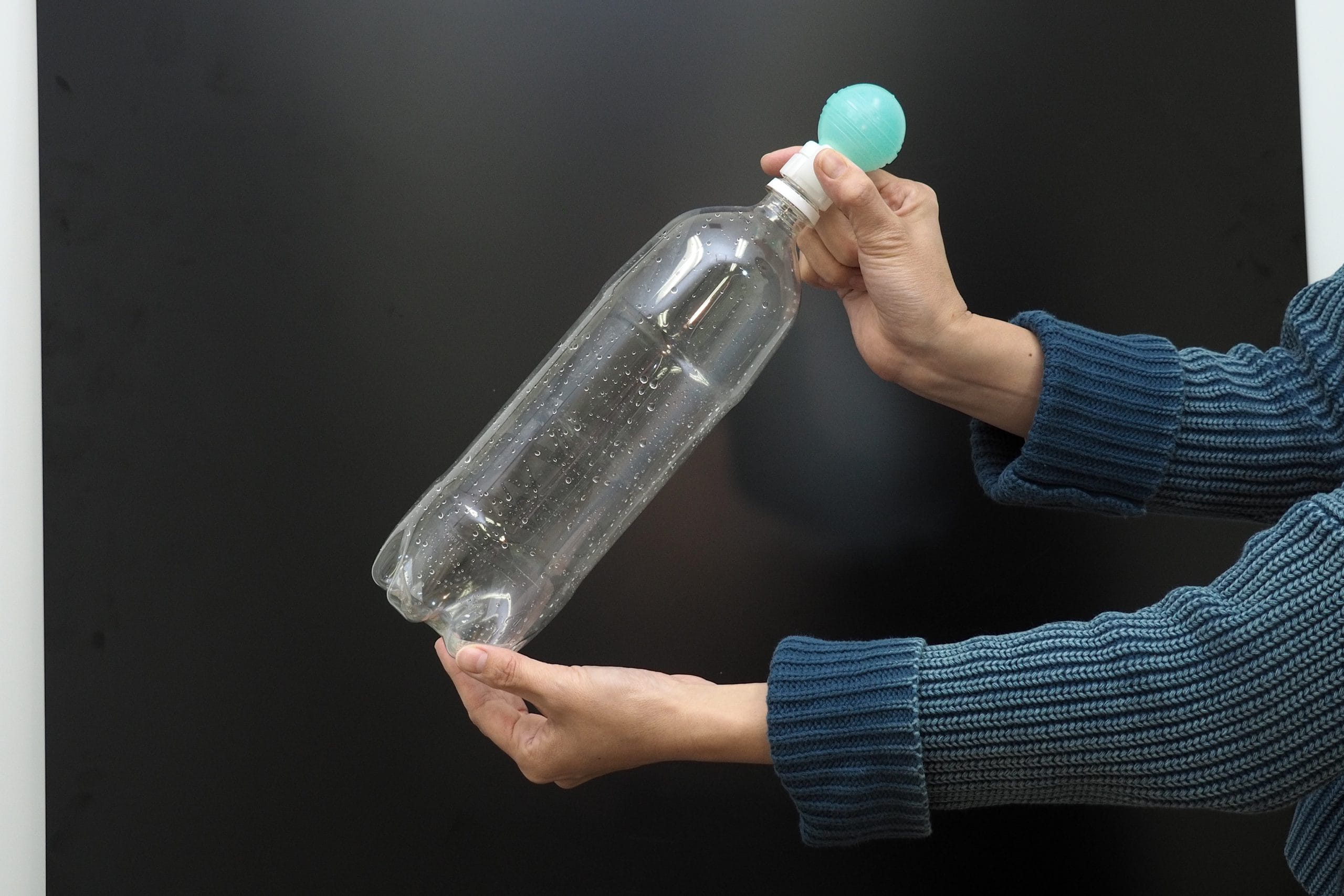 これはボトルの中の空気が冷えて、目に見えない水蒸気が水の粒になって見えるようになった、ということだよ。