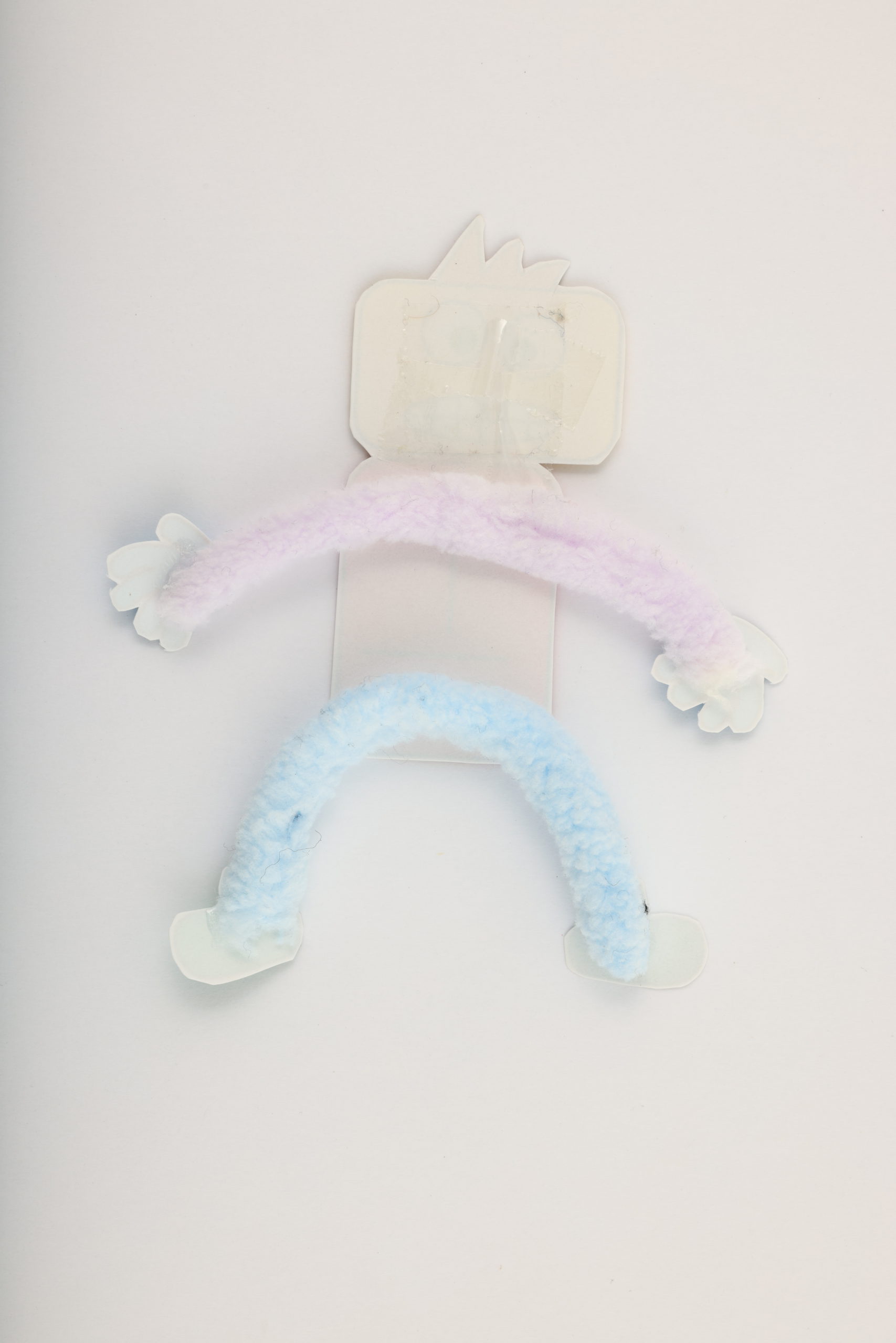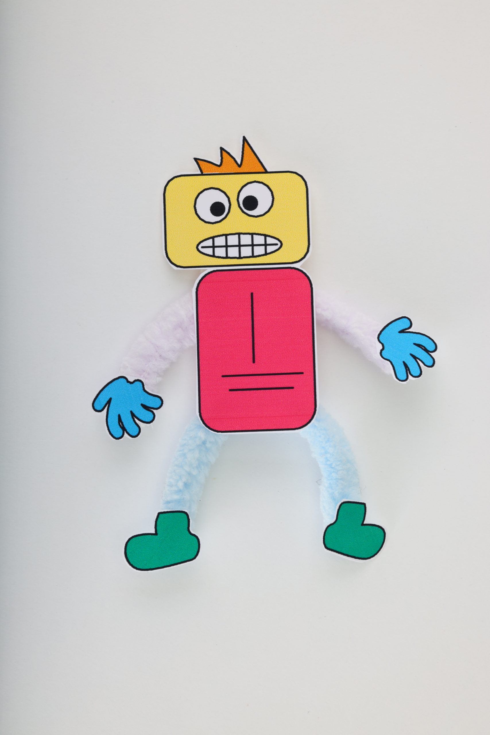 人形は、針金が動いたときに踊っているように見えるようにしたいよね。今回は、紙で胴体をつくって、手足を手芸用のモールを使っているよ。紙に好きな絵を描いて、モールを手足として貼り付けるだけだよ。