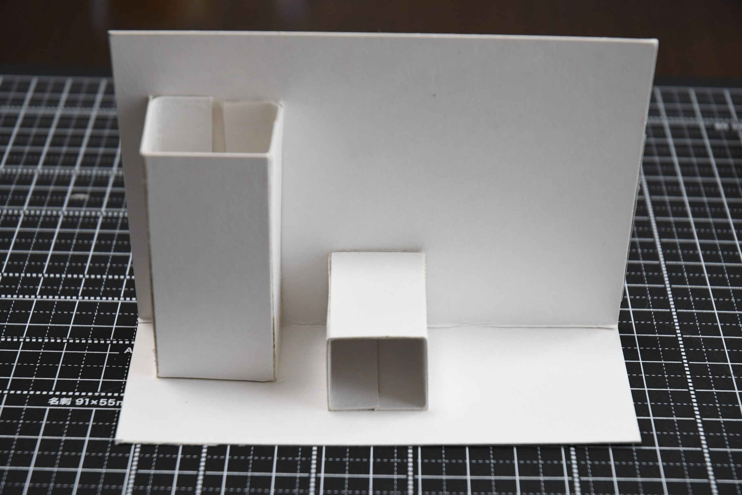 型紙をボール紙に印刷してから切り取る。切り取ったら、折り線をインク切れのボールペンや、鉄筆