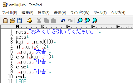 では、さっそくエディター(ここではTeraPadを使っている)を起動して、次のようなプログラムをつくっていこう。ファイル名は「gazou1.rb」にしたよ。