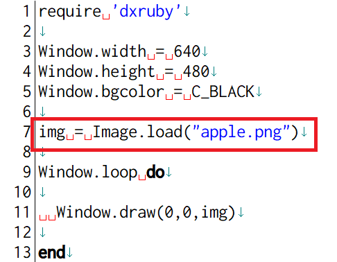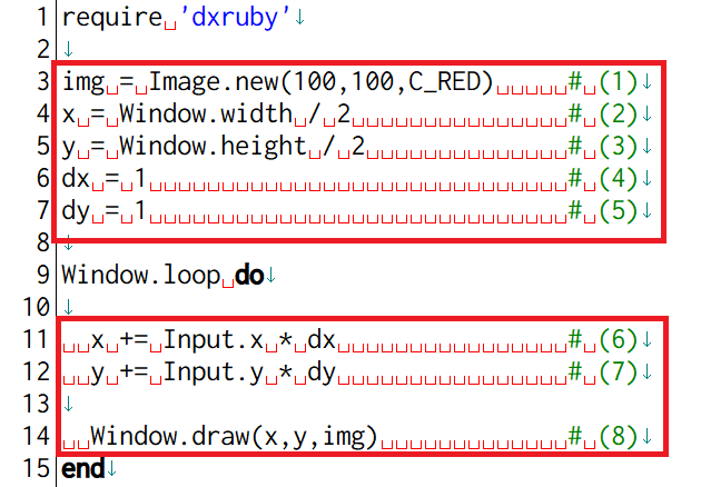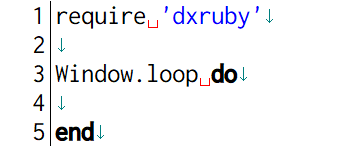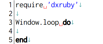 1行目でDXRubyのライブラリを呼び込んで、1行目のrequire行から3行目のWindow.loop do の行までにプログラムに必要な各種設定やメソッドを書き込んでいく。