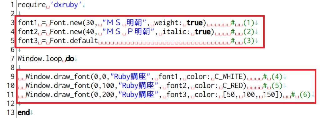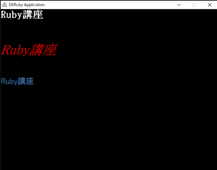 9行目(コメント(4))、10行目(コメント(5))の行では、色指定をDXRubyの色定数(ソースコード中で扱
