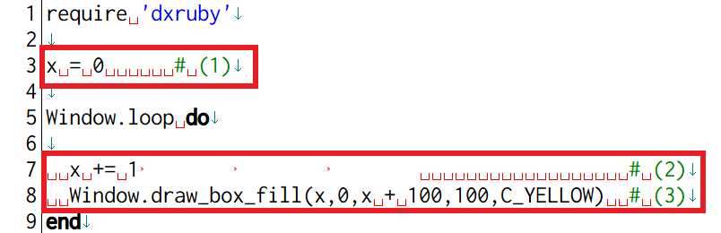 横方向(x座標の方向)に四角形を移動させるプログラムにする。赤枠で囲んだ部分を追加して「idou_yoko.rb」というファイル名で保存してね。