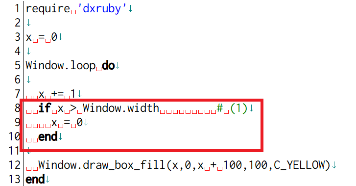 えたら)、という意味になるよ。そしてこの場合、次の行(9行目)でx 座標の値を0、すなわち枠の左端に移動させているよ。