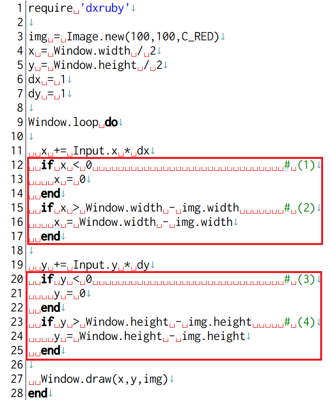 8行目(コメント(1))から始まるif 文で、x > Window.width の条件式