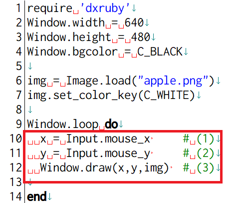 「1.1 画像を取り込むプログラムをつくってみよう」でつくった「gazou2.rb」のプログラムを改造するよ。リンゴの画像を表示していたので、さらにマウスで動かすことができるようにしよう。次の赤枠で囲んだ内容に変えて、出来上がったら「idou_gazou.rb」というファイル名で保存してね。