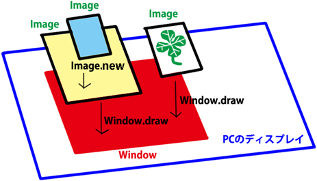 Imageオブジェクトは、Image_loadメソッドで画像を読み込んでつくることもできるし、前回の三角形を描いたようにImage.newメソッドで描画してつくることもできる。それをWindow.drawで指定した座標でウィンドウに描いている。