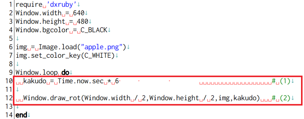 12行目(コメント(2)) の行では、Window.draw_rot メソッドを使って、画像オブジェクトを描画させるx、y 座標、画像オブジェクト(img) 、そして回転角度を指定している。