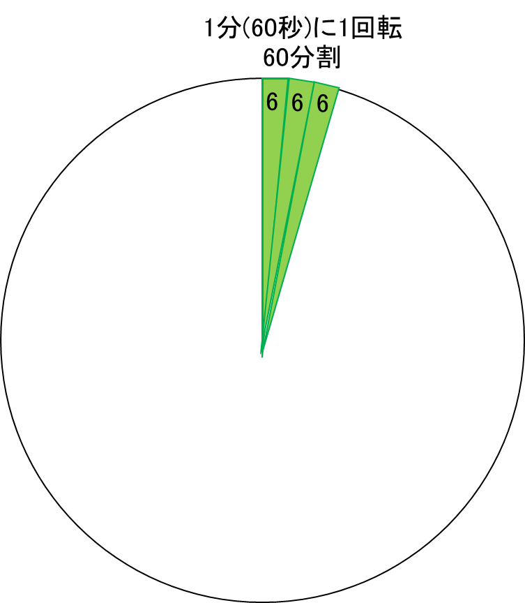 10行目(コメント(1) )は、Time.nowメソッドで現在の時刻を読み取り、さらにsec メソッドで、現在時の秒数だけ読み取っている。下の図のように、1分間は60秒だから、1分間に1回転、すなわち1周360度回転させるためには、360 ÷ 60 = 6 を掛けてkakudoに代入するよ。