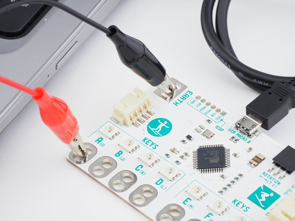 をパソコンにつないで、ワニ口クリップではさんで好きなものをつなぐ。それだけでパソコン上のプログラムで、つないだものをコントロールできるんだ。