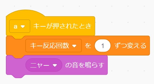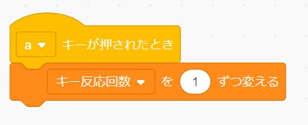 「イベント」カテゴリーの「“スペース”キーが押されたとき」ブロックで、“a”キーに変えよう。それに、「変数」カテゴリーの「“キー反応回数”を“1”ずつ変える」ブロックをつなごう。
