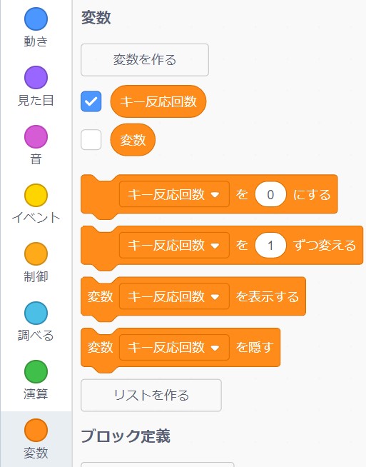 を使う。「変数」カテゴリーで「キー反応回数」という変数を新しくつくろう。