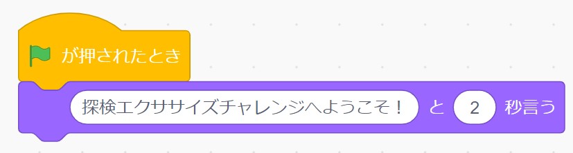 が押されたとき」ブロックに組み合わせるときに“こんにちは!”を“探検エクササイズチャレンジにようこそ!”に変えるよ。