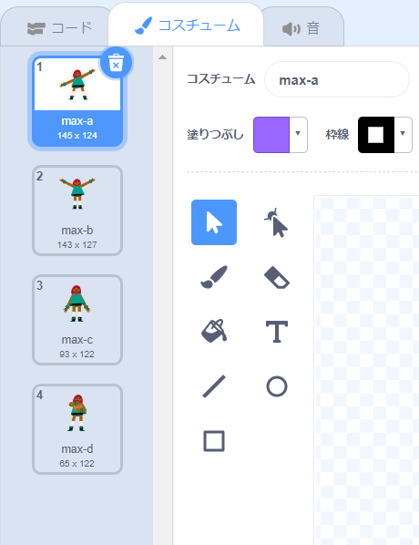 でも、今回のゲームで使えるような、両うでを水平にしたり、頭の上で手を合わせるというポーズのスプライトは見つからない。そこで、「Max」というスプライトを使って、これを変更