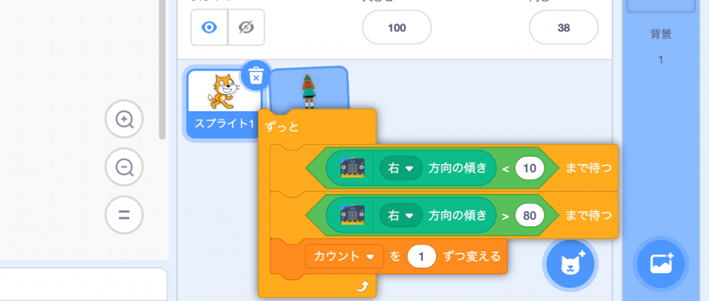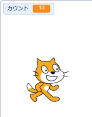がったら、コードエリアに戻って、プログラムをつくっていこう。うでの動きをカウントするプログラムは、ネコのスプライトでつくったものがあるよね。それを活用しよう。
