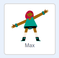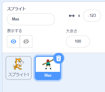 「Max」をクリックすると、ステージの上に表示されたね。ステージにはもともとあったネコとMaxがあるけど、Maxの方を選択