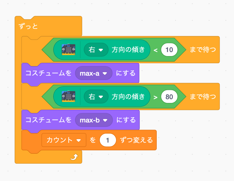 ② コピーしたプログラムに、コスチュームのブロックを追加していこう。「見た目」カテゴリーの「コスチュームを“max-a”にする」ブロックを「“右”方向の傾き<“10”まで待つ」ブロックの下に、「コスチュームを“max-b”にする」ブロックを「“右”方向の傾き>“80”まで待つ」ブロックの下に入れよう。