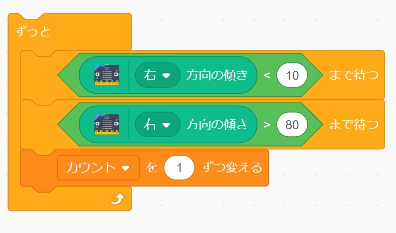 」カテゴリーの「“ ”<“50”」ブロックの左側に、先ほどのプログラムで使った「“右”方向の傾き」ブロックを入れて、右側の数値は“10”にする。それを「制御」カテゴリーの「“ ”まで待つ」ブロックに入れる。もう1つ同じようなブロックをつくるけど、「“右”方向の傾き>“80”」ブロックを「“ ”まで待つ」ブロックに入れるよ。