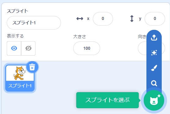 してくれるインストラクターをつくってみよう。「スプライト」の右下にある、ネコのアイコンのボタンをクリックして、スプライトのライブラリーを開くよ。