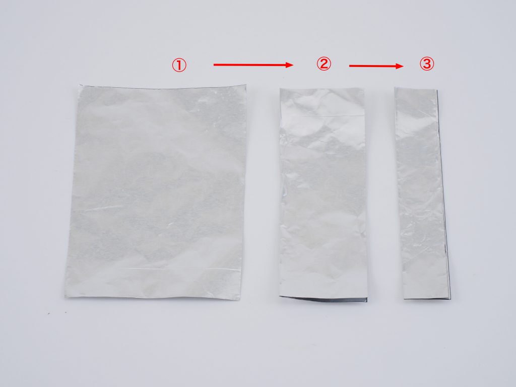 折りたたんでつくった4枚のアルミホイルの帯を、カバンの肩ひもに巻