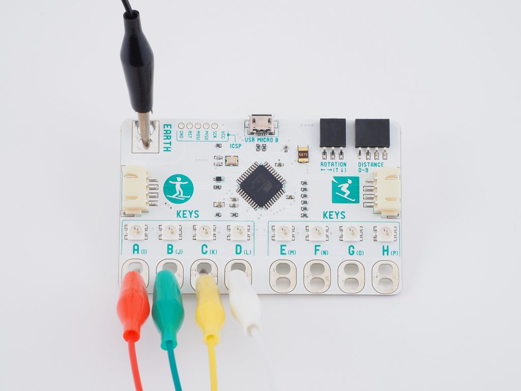 をパソコンにつないで、ワニ口クリップではさんで好きなものをつなぐ。それだけでパソコン上のプログラムで、つないだものをコントロールできるんだ。
