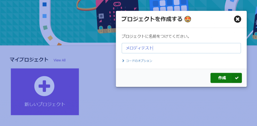 けてくれる。せっかくだからプロジェクト名をつけよう。メロディのブロックを試すので、「メロディテスト」としてみたぞ。