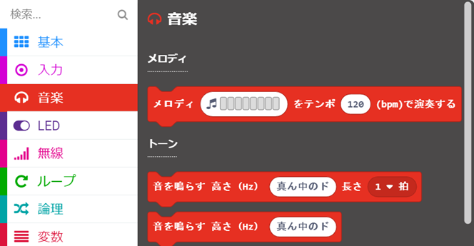 プロジェクトが開いたら、まずは「音楽」カテゴリーを開いて、メロディのブロックを見つけよう。