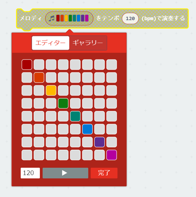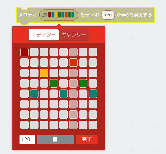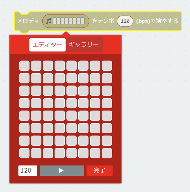 メロディブロックで、再生ボタンを押してループ再生させながら、それぞれの音を変更してメロディをつくってみよう。知ってる曲を再現してみても、自分でオリジナルのメロディをつくってみてもいいだろう。マス目をクリックすることで鳴らす音を指定できる。