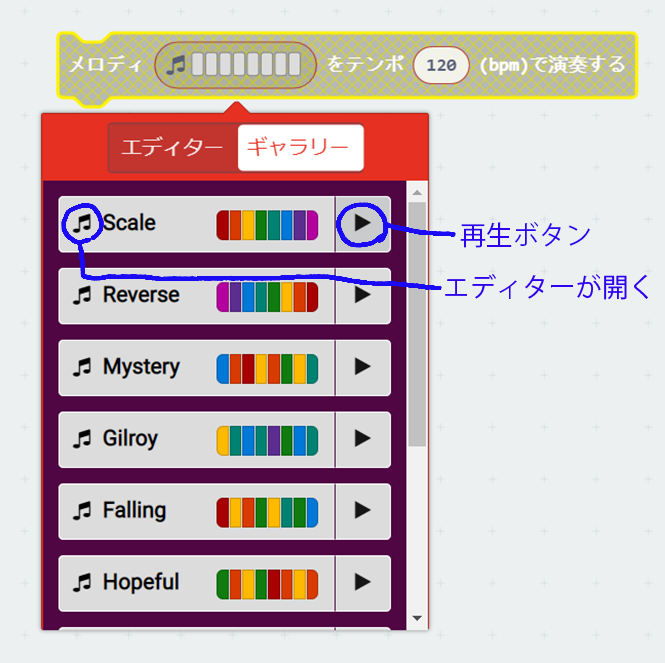 画面の上側にある「エディター/ギャラリー」を切り替えることで、自分でつくることもできるし、MakeCodeに用意