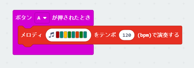 「入力」カテゴリーの「ボタンAが押されたとき」ブロックを、先ほどつくったメロディブロックと組み合わせたら完成だ。探検ウォッチに書き込んで試してみよう。