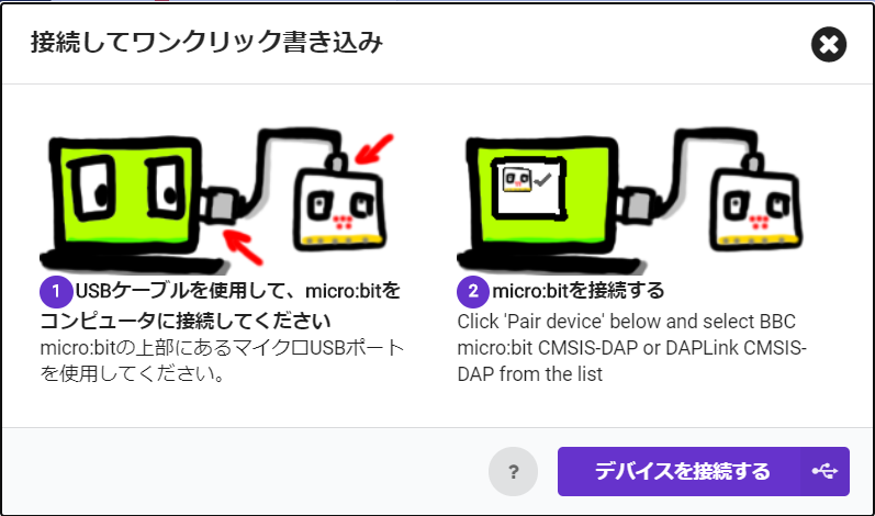 する」をクリックすると、「接続してワンクリック書き込み」というポップアップウィンドウが表示される。ここで「デバイスを接続する」をクリックして、micro:bitを接続しておこう。