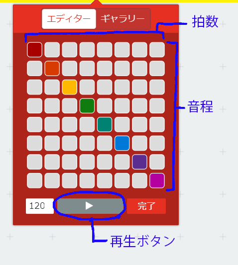 読み込まれたメロディは、下にある再生ボタンを押すとくり返し再生される。見ていると左から右へと音は流れていく。それぞれのマス目の列で色が変わっている部分の音が出ているようだね。