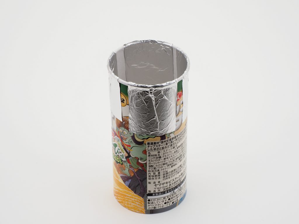 、アルミホイルでつくるよ。ここでは「チップスター」の箱
