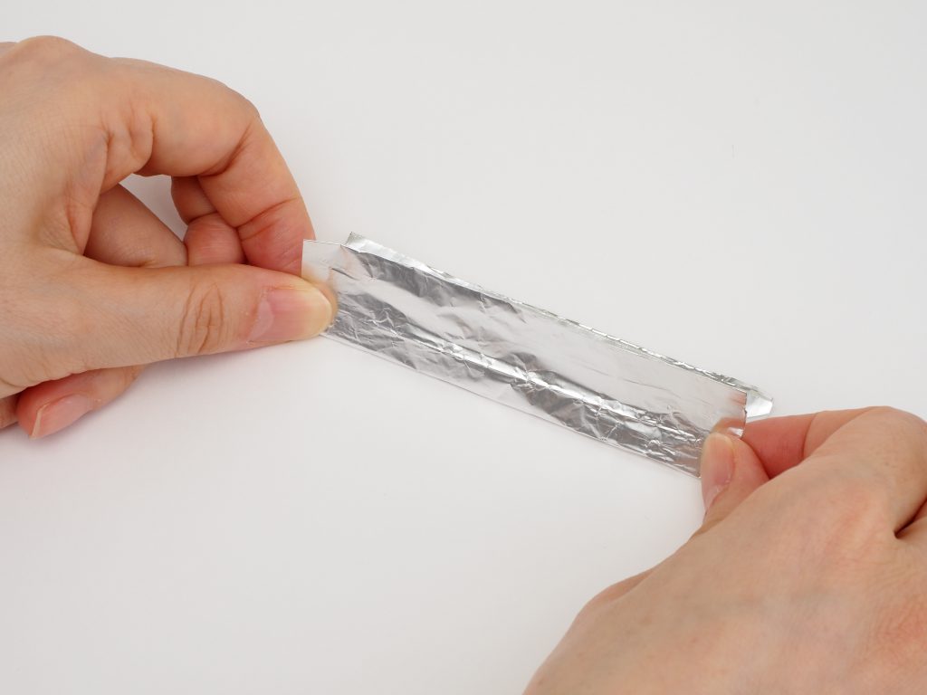 風鈴の「舌」は、アルミホイルBを、折って細長くする。半分に折るのを2回繰り返すくらいがちょうどいいかもしれない。