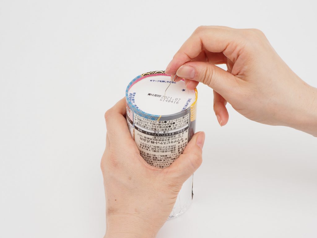 ① 「鐘」にしている空き箱の底の中心あたりに、舌を通す穴を開けよう。きりがあれば便利だけど、ちょっと固めの針金や、とがった鉛筆