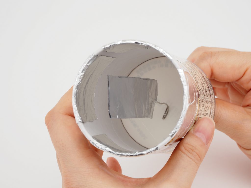 り付けよう。箱のへりをはさむように貼るのがポイント。この時、貼り付けたアルミホイル同士が接触