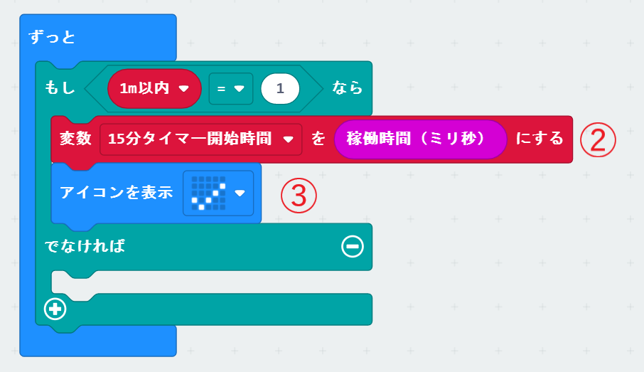 したがって、「もし〈1m以内=1〉なら」の部分にタイマー開始時刻