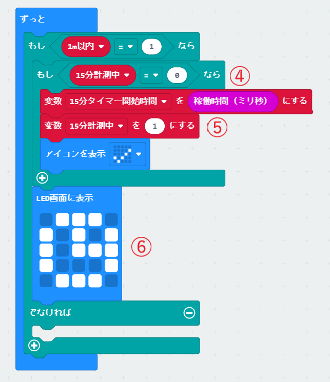 再び近づいた時に、変数「離れている時間を計測中」は無効にするために、「もし〈15分計測中=0〉なら」のコードの最後に、「変数“離れている時間を計測中”を0にする」ブロックの追加も忘れずに入れよう(⑧)。