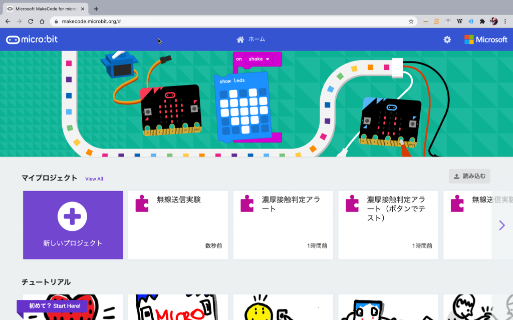 MakeCodeのホーム画面では、自分の作品(マイプロジェクト)の下にいろいろなチュートリアルが用意されている。