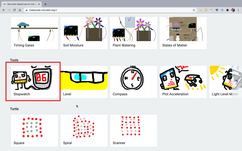 下のほうにスクロールしていくと、「Tools(ツール)」というカテゴリーがあって「Stopwatch(ストップウォッチ)」というのがある。どんなプログラムか見てみよう。