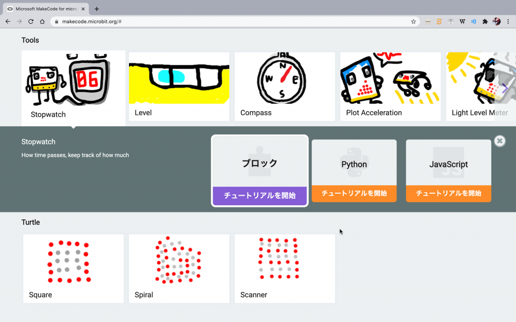 「Stopwatch」をクリックすると、「チュートリアルを開始」が3つ表示される。「ブロック」の「チュートリアルを開始」をクリックしよう。