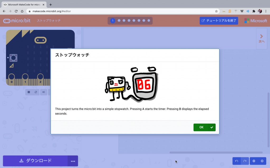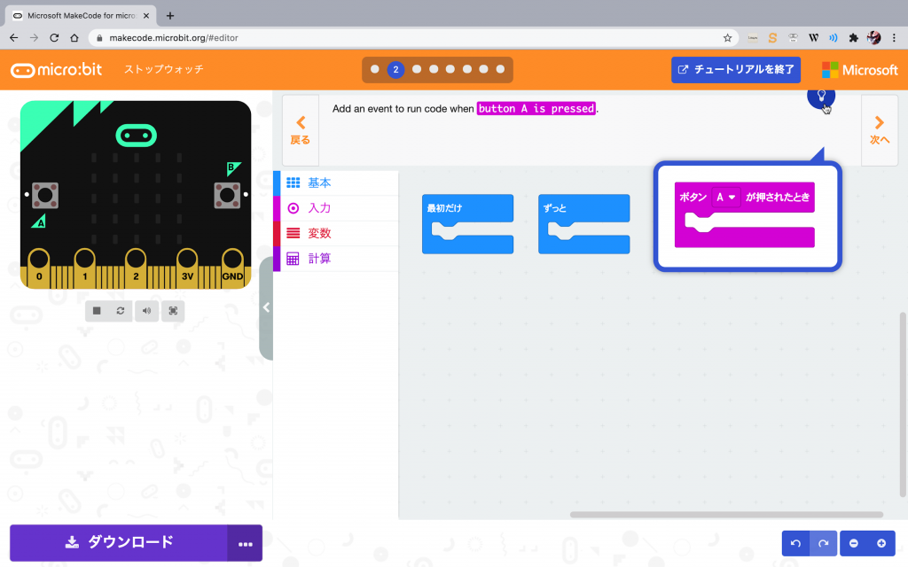 してみよう。説明に書かれたブロックが表示され、それは日本語表示のブロックだからどのブロックを使うかがわかるだろう。このチュートリアルを元に、「Stopwatch」をプログラミングしてみよう。
