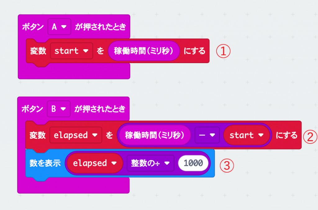 「稼働時間」とはmicro:bitのプログラムが実行されてからの時間がずっとカウントされていくものだ。ここでつくったコードを見てみると、開始時点の稼働時間を変数「start」に入れて(①)、停止したときの稼働時間から、変数「start」を引いて時間を計測している(②)。LEDディスプレイに表示するときの「整数