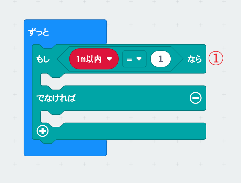 」カテゴリーの「もし〈真〉なら~でなければ~」ブロックを使い、1m以内かどうかで振り分ける処理をつくる。ここで変数「1m以内」をつくってフラグとして使う。