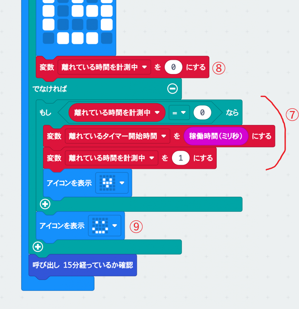 離れているタイマーの計測も常に更新されてはきちんと測れないので、変数「離れている時間を計測中」というフラグでコントロールしているぞ。コード自体は、さっきつくった15分を計測するコードとほぼ同じだ(⑦)。使う変数が違うのと、アイコンの表示は「ちいさなハート」にしている。