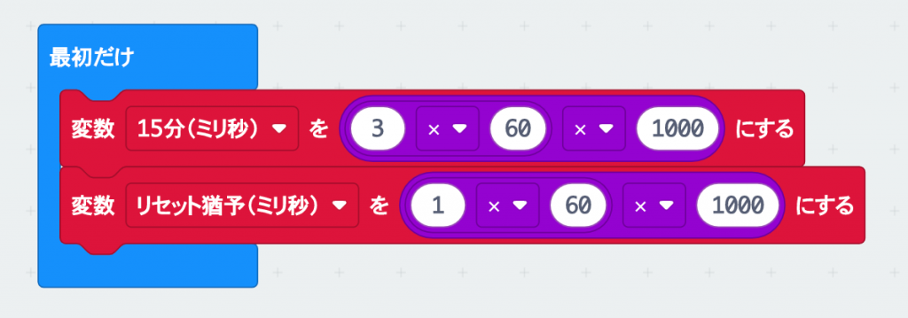 「最初だけ」ブロックの中でそれぞれの数字を設定しておこう。15分のカウント用は変数「15分(ミリ秒)」、一時的に離れている時間は変数「リセット猶予