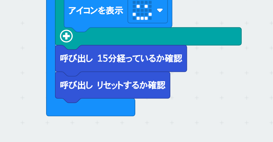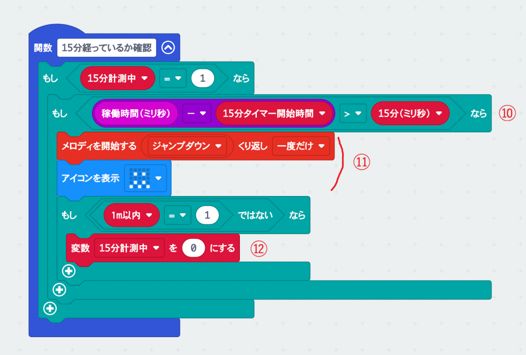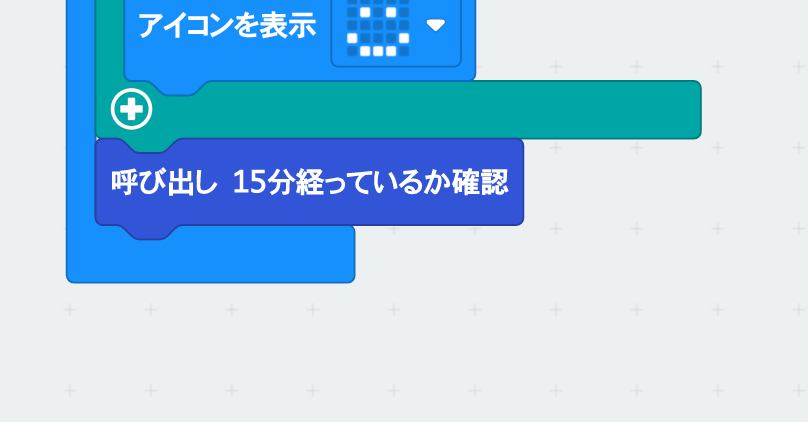 15分経っているかの確認は、関数「15分経っているか確認」をつくる。この関数の呼び出しは、「ずっと」のプログラムの一番最後に入れる。