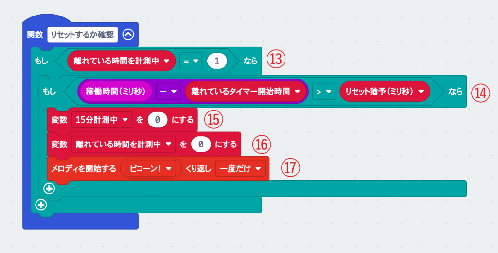 もし一定時間離れていたら15分タイマーを無効にして(⑮)、計測していた時間も無効(⑯)にしている。動作確認用に「メロディを開始」ブロックで音も鳴らしてみたぞ(⑰)。