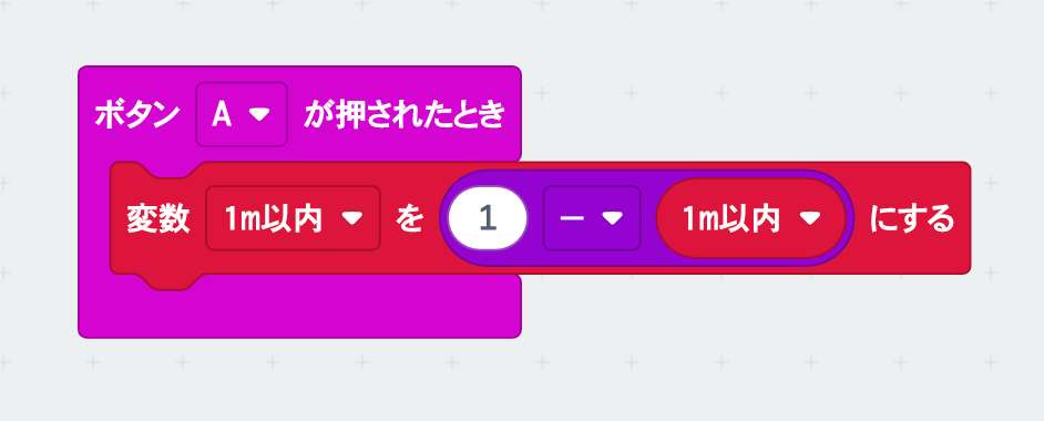 シミュレーターで動作確認をしてみよう。シミュレーターの場合はボタンを使って「1m以内」かどうかを切り替えるよ。「ボタンAが押されたとき」ブロックで次のようなコードをつくった。