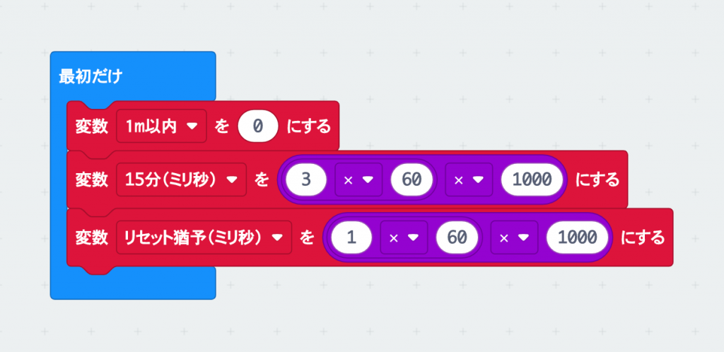 「最初だけ」ブロックのプログラムにも、「変数“1m以内”を0にする」ブロックを入れておこう。